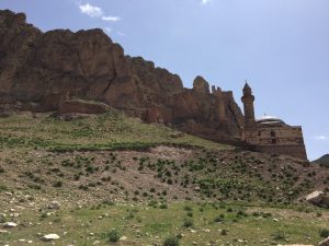 De route is fenomenaal. Om de paar kilometer zien we een kudde paarden en wat nog beter is enkele kuddes kamelen. Echte kamelen met twee bulten! De kamelen zijn over het algemeen hun wintervacht kwijt, maar sommigen behouden nog een soort kapsel op hun kop met bijpassende weelderige baard. De verdwaasde blik en hun schommelde loopje maakt het een hilarisch beest. De moskee ligt prachtig tussen rotsen geklemd met uitzicht op de Kaspische zee die er mediterraan blauw uit ziet. De moskee zelf is niet zo veel aan, wat wel grappig is dat de plaatselijke bevolking er in ligt te slapen. Lekker koel zo onder de grond.