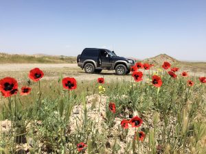 We zijn het rijden en het zoeken naar een hotel beu en zetten een stukje van de weg ons tentje op. De grote weg is uit het zicht en het uitzicht weer eindeloos. 10 meter van ons tentje is een zandheuvel met holen, waar steppemarmotten leven. Voorzichtig komen ze een voor een hun hol uit, om ons goed te bekijken. Een hop (bijzonder leuke vogel) is druk in de weer verderop zijn nest in elkaar te zetten.